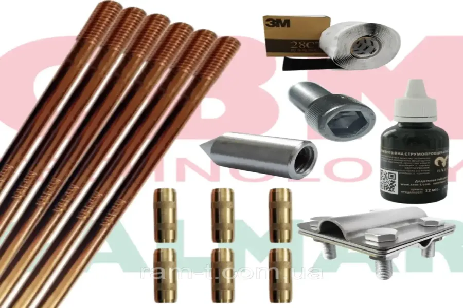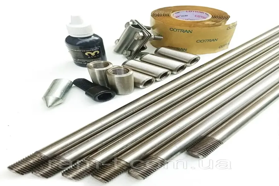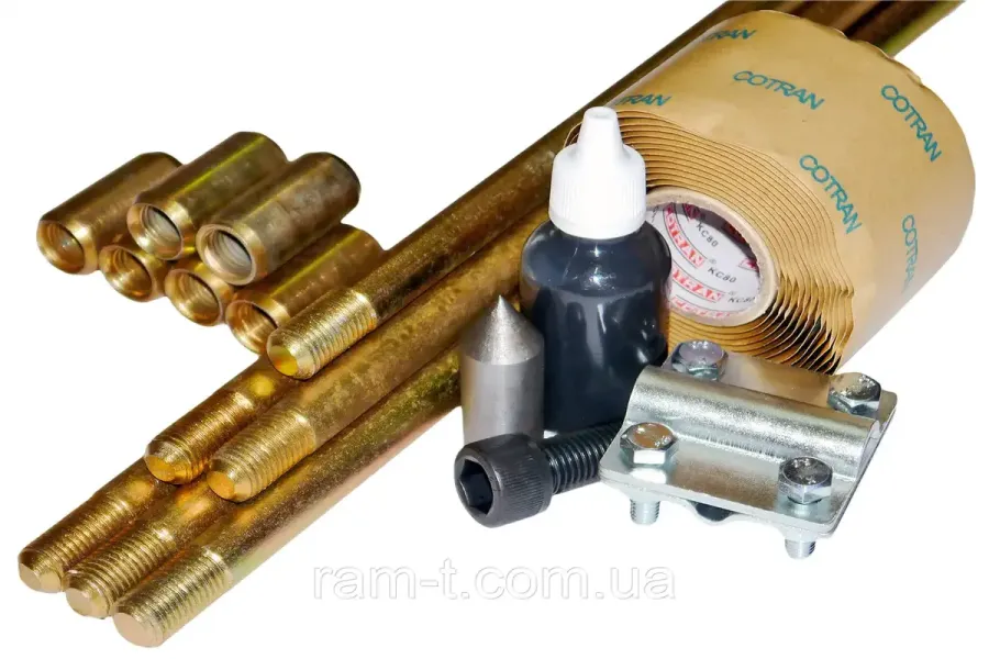 Комплект містить всі необхідні для монтажу компоненти, які легко і надійно з’єднуються без використання зварювання.Заземлювач глибиною 9 м збирається з шести оцинкованих стержнів довжиною по 1,5 метри.
